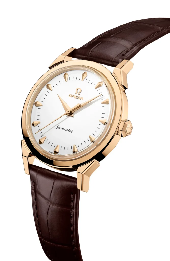 La estética toma referencias de Seamaster de finales de los 50: asas esculpidas, esfera blanca de esmalte grand feu, índices aplicados en Moonshine Gold y agujas tipo dauphine. El fondo lleva un grabado Milano Cortina con el logo olímpico. Por dentro monta el Omega Co-Axial Master Chronometer Calibre 8807, automático, y se entrega con correa de piel marrón.